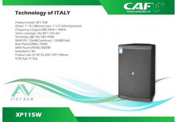 Đặc biệt, củ treble B&C Italy của XP115W sử dụng vòng dây lên tới 65mm – lớn nhất trong phân khúc, mang lại âm cao sáng, không chói, ổn định khi hoạt động ở cường độ cao. Đây chính là một trong những dòng loa mạnh nhất hiện nay của CAF, đảm bảo hiệu suất RMS lên đến 700W và đỉnh công suất 2800W – hoàn hảo cho không gian âm thanh đẳng cấp.